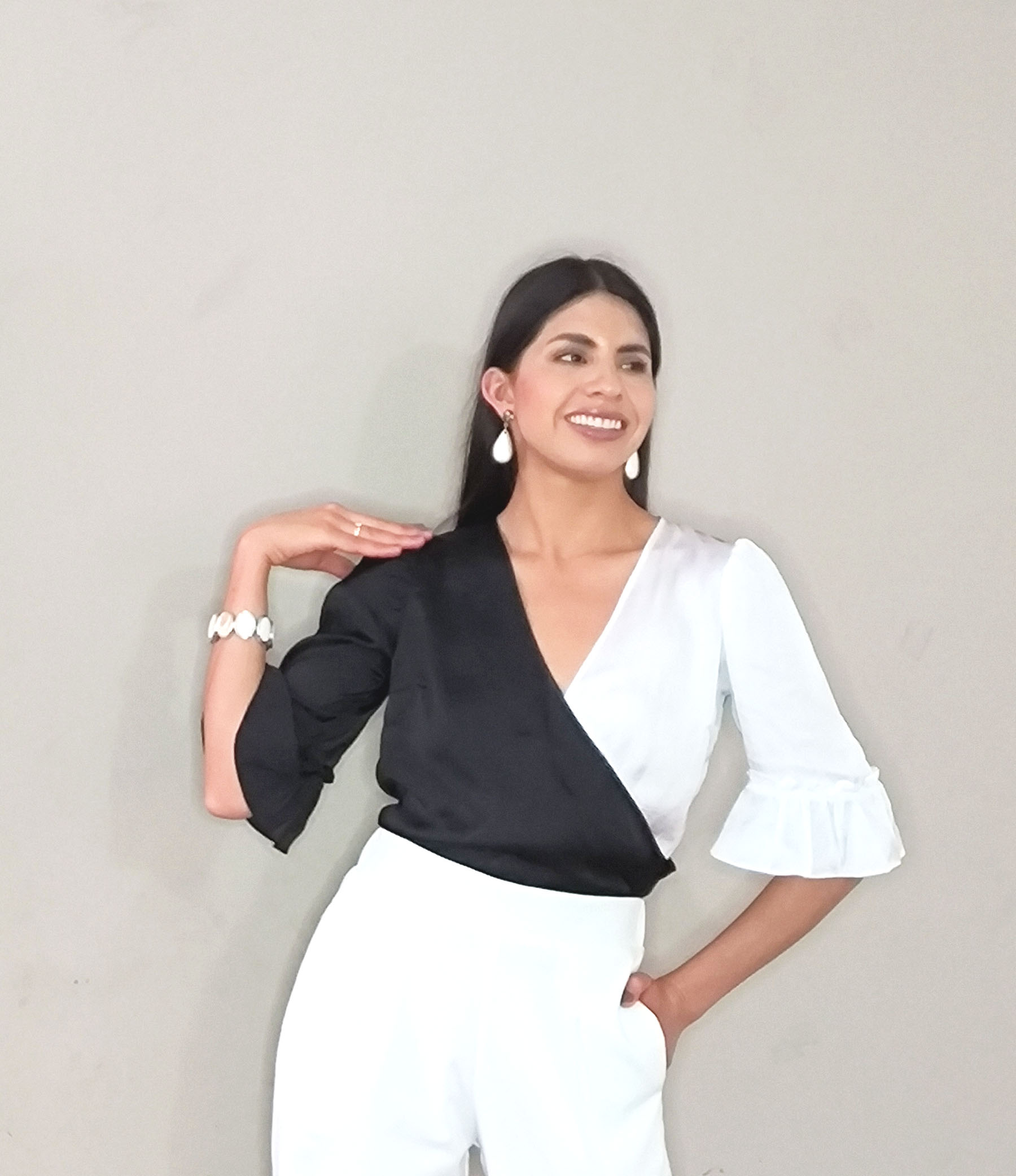 Blusa cruzada en dos colores elaborada en seda satinada italiana, manga 3/4