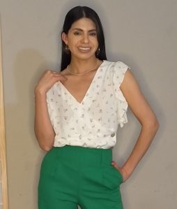 Top elaborado en gamuza pima con detalle de bobos en escote