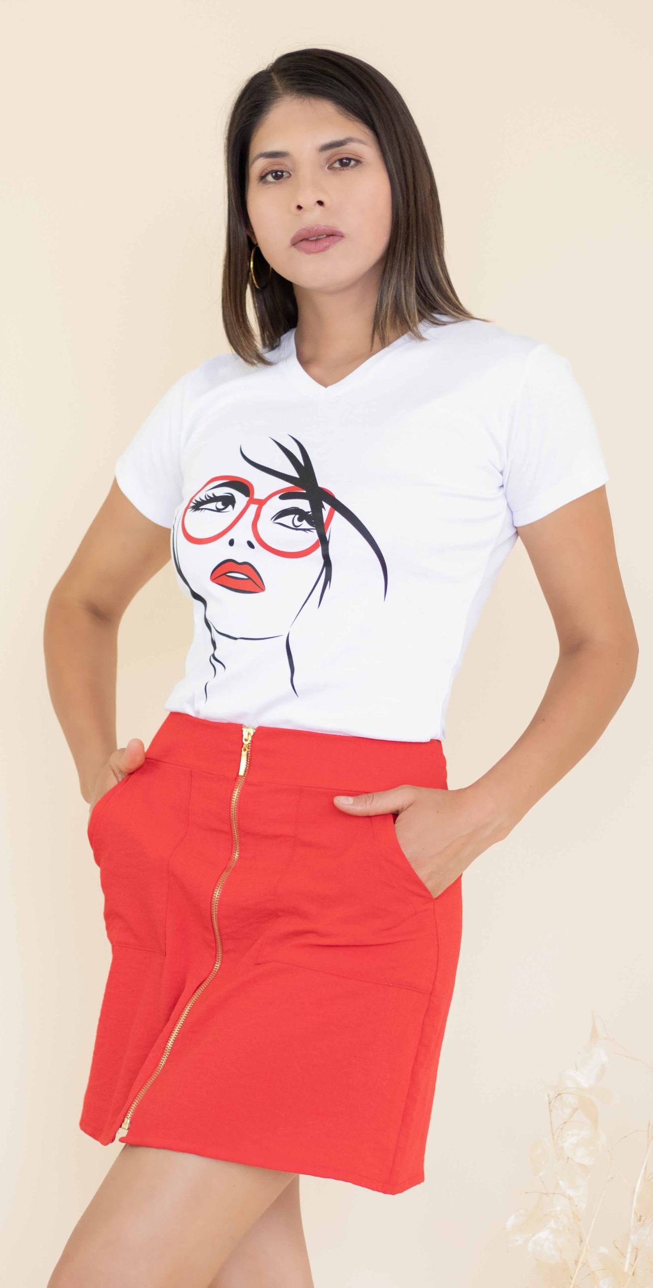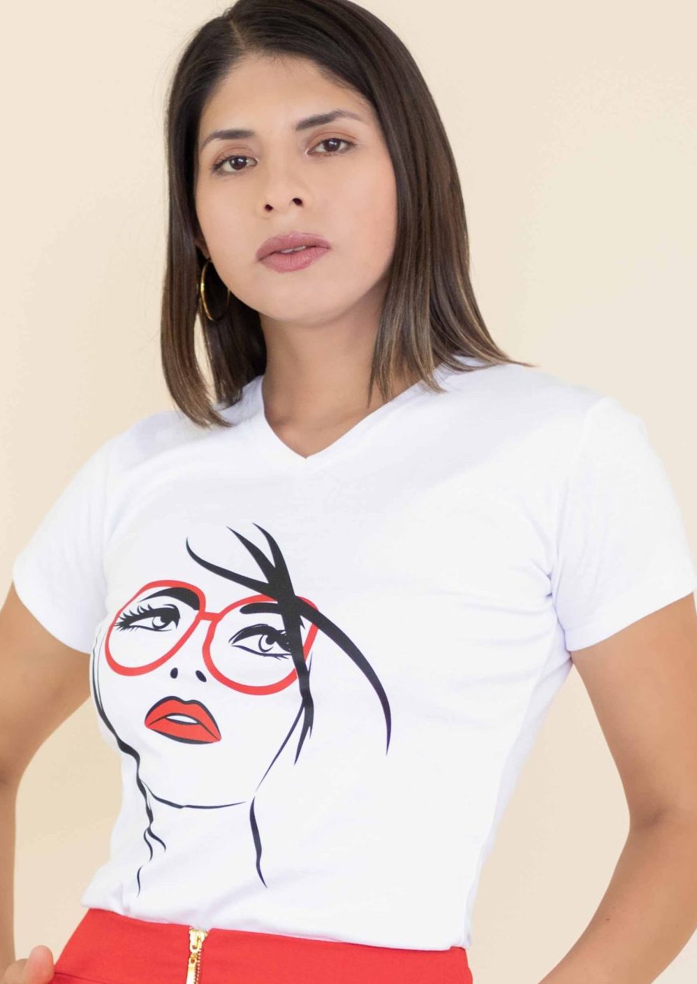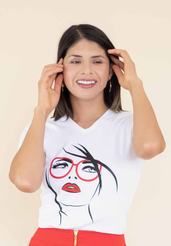 Polo elaborado en gamuza pima reactivo, estampado labio color rojo, detalle de mangas en tull escarchado transparente